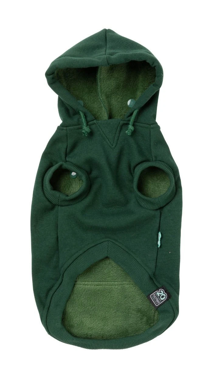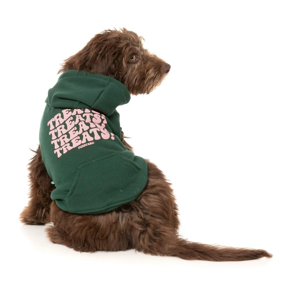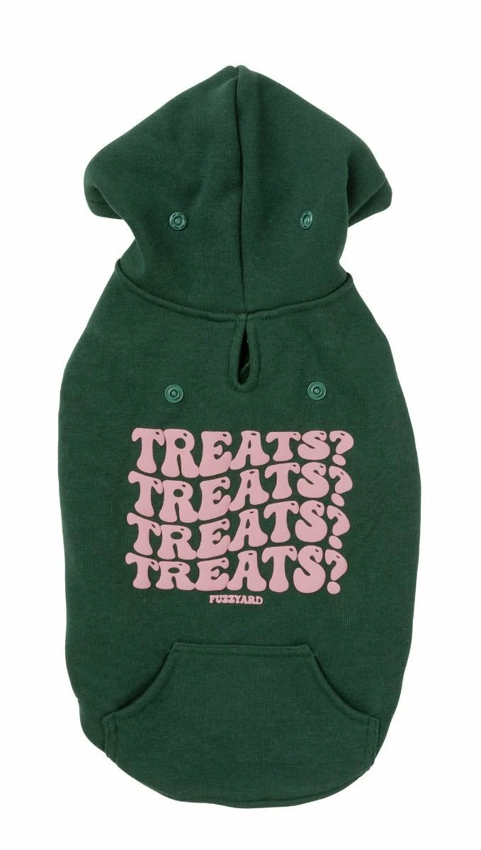 This is a Green Treats Hoodie Dog Coat by FuzzYard. This light dog hoodie will keep your dog warm and comfortable this winter. It has elastic ribbing for your sleeves to make fitting easy. The harness hole will allow you to take your dog for a walk while wearing this stylish dog jumper. Your dog will look fresh in this 100% cotton dog hoodie.
