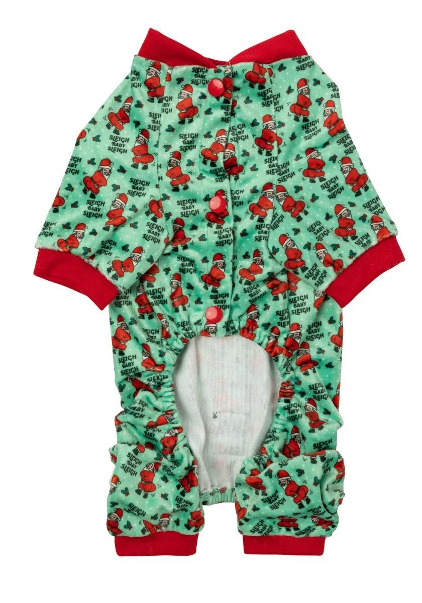 This is a Sleigh Baby Sleigh Christmas Dog Pyjamas by FuzzYard. This X-Mas themed dog pyjamas are made of a soft cotton. It is non-toxic, non-allergenic and machine washable.